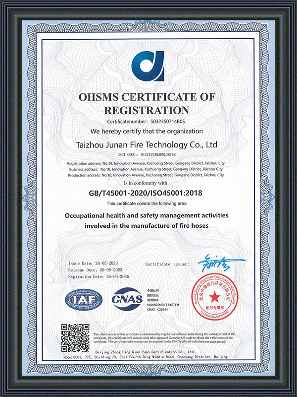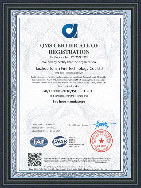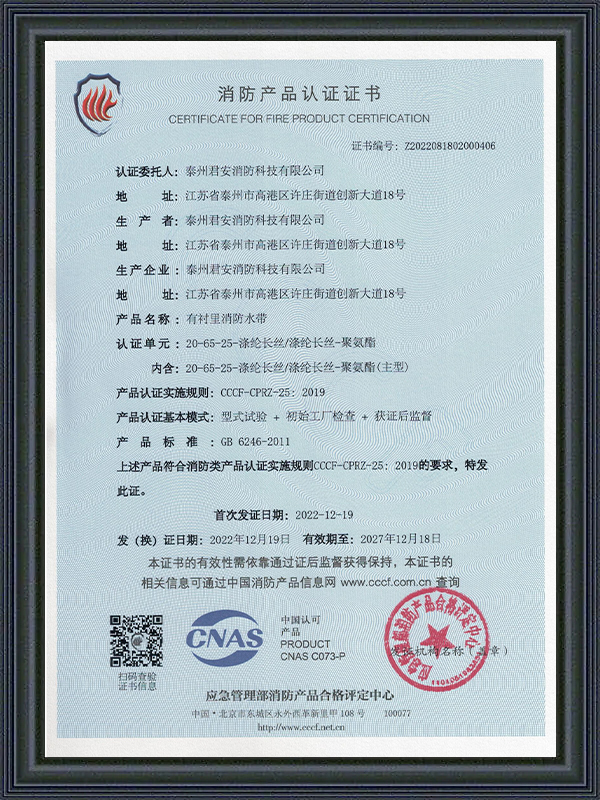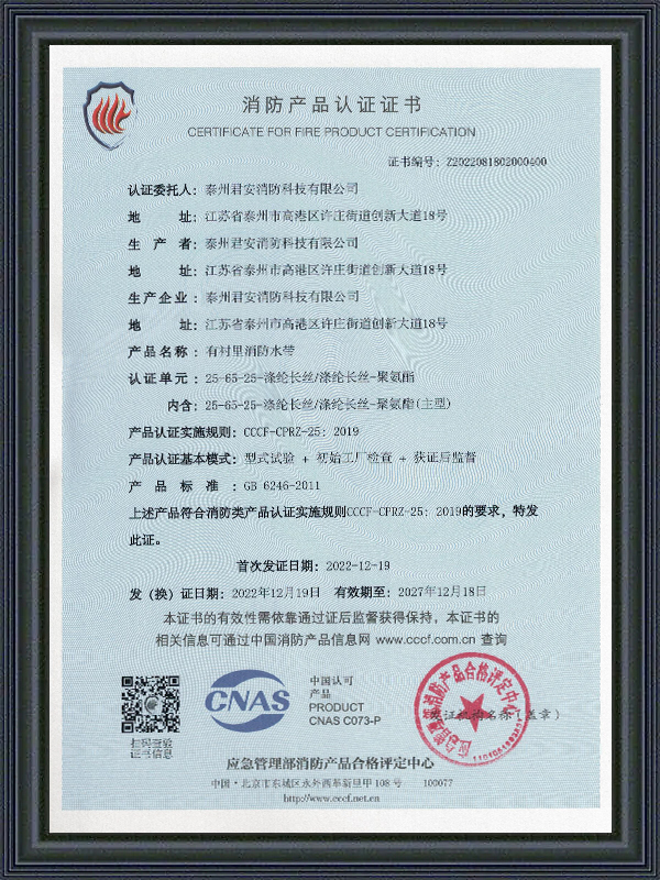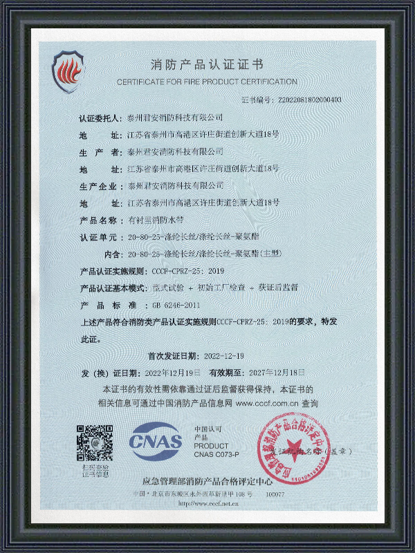 Tutti i tubi Jun'an sono conformi agli standard CE, CCC e FM Global, garantendo affidabilità in situazioni critiche.