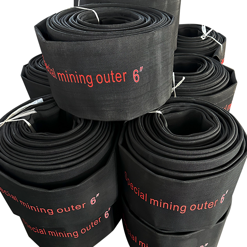 Tubo piatto per miniere da 6 pollici con connettore Storz, tubo piatto per carichi pesanti e resistente all'abrasione per il drenaggio esterno nel settore minerario. È dotato di attacchi Storz a connessione rapida e si appiattisce quando vuoto per riporlo facilmente.